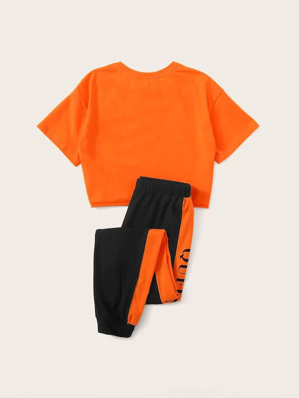 Girls Neon Orange Letter Print Tee And Pants Set SH
